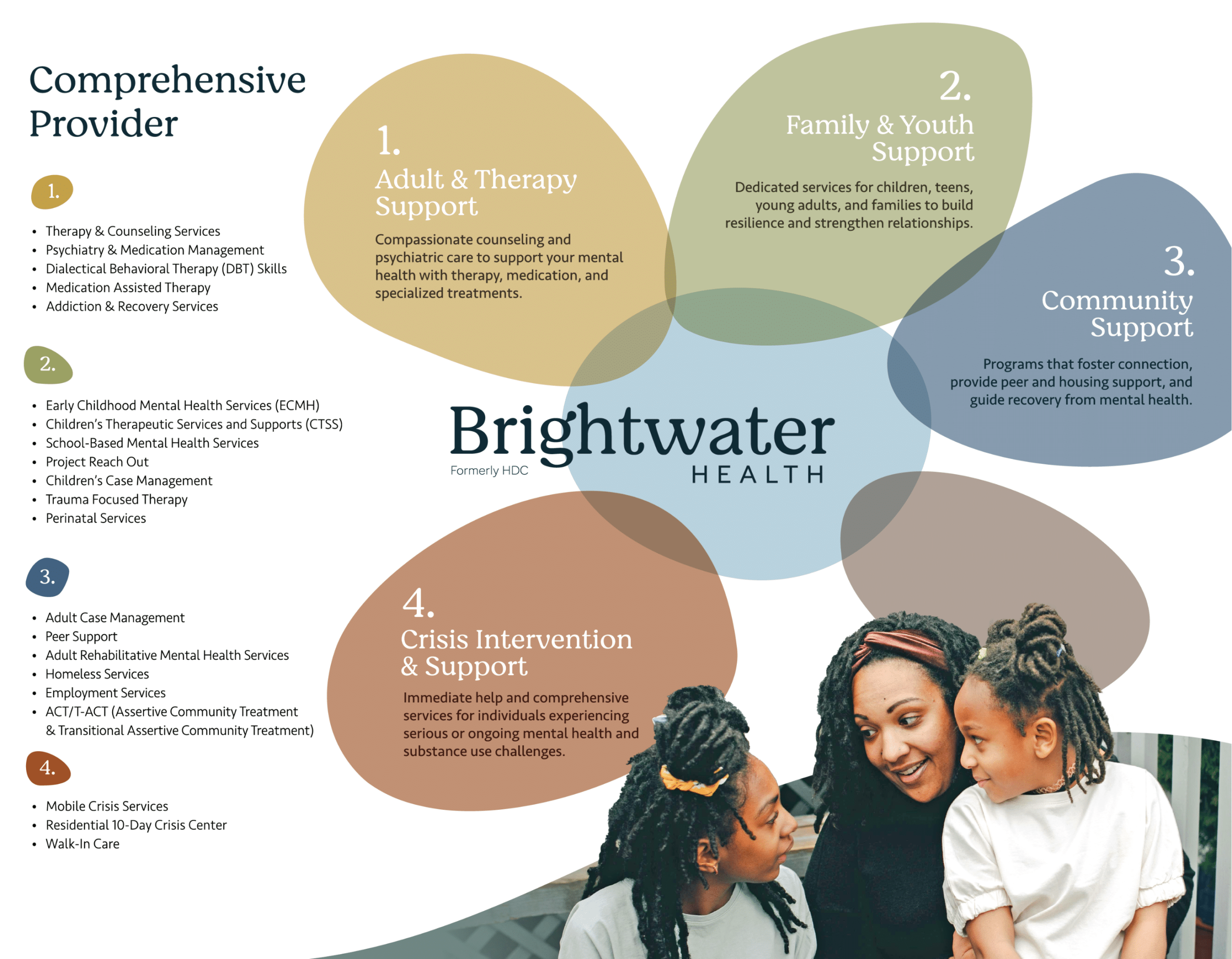 The CCBHC services model improves mental health and substance abuse treatment services. This is accomplished by creating more comprehensive and expansive service delivery while removing barriers to access. CCBHC ensures rapid and unobstructed access to care for all people regardless of personal circumstances or ability to pay. Through this coordinated process, each of our clients throughout the Brightwater community can expect the highest quality of care.